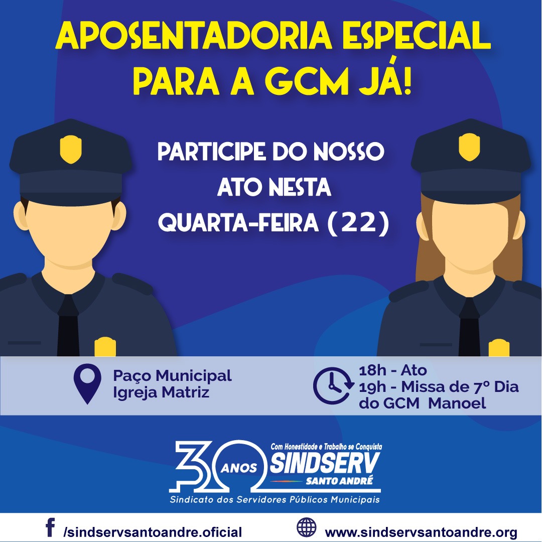 Logo mais, às 18h, Guardas Civis Municipais de Santo André (GCM) irão realizar ato em frente ao Paço Municipal e depois caminharão rumo à igreja Matriz, onde acontecerá a Missa de 7 º dia do GCM Manoel, às 19h.